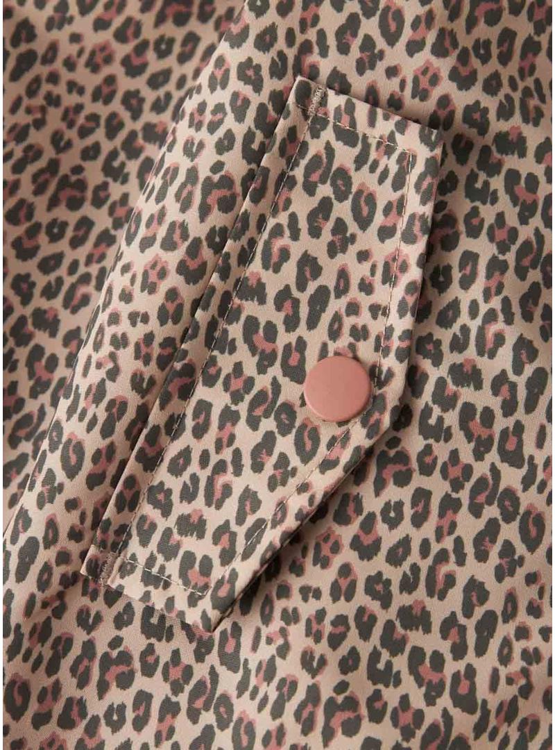 Casaco Name It. Modelo Mania. Estampa de leopardo. Bolsos laterais. Cor marrom, bege e preto. Fecho principal com botões de pressão. Punhos elásticos. Babados nos ombros. Forro interior de poliéster. Gola alta.