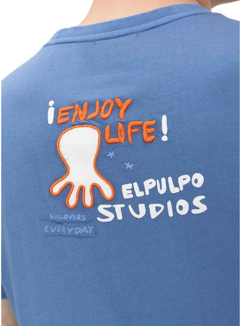 Camiseta El Pulpo. Modelo Enjoy. Gola redonda. Manga curta. Ajuste regular. Ilustração estampada e bordada com detalhes em branco e laranja.