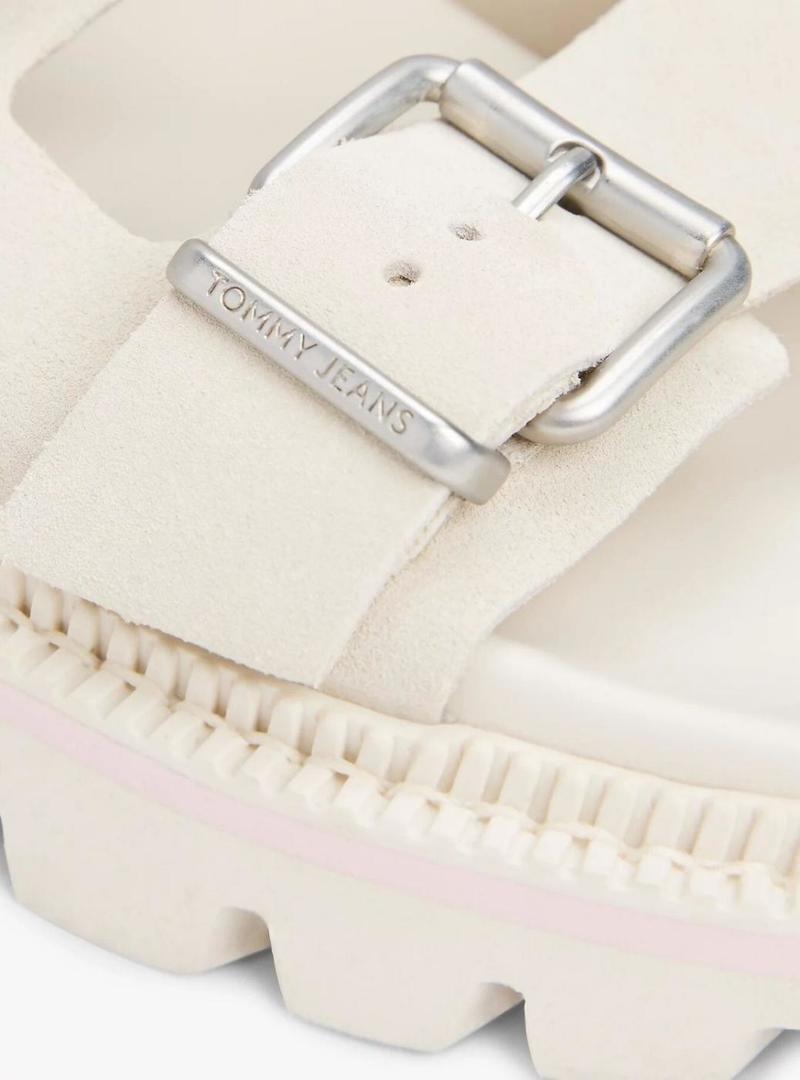 Sandálias Tommy Jeans. Modelo Double Strap. Cor branca. Parte superior em camurça. Dupla correia com fivela metálica. Sola EVA track. Detalhes distintivos da marca.