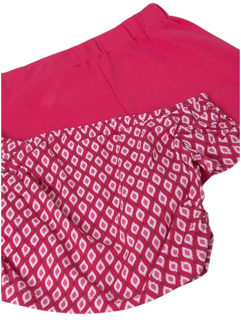 Conjunto Mayoral. Top e short. Camiseta manga curta. Estampa geométrica. Cor rosa. Formato curto. Short cor rosa - Cintura alta de elástico.