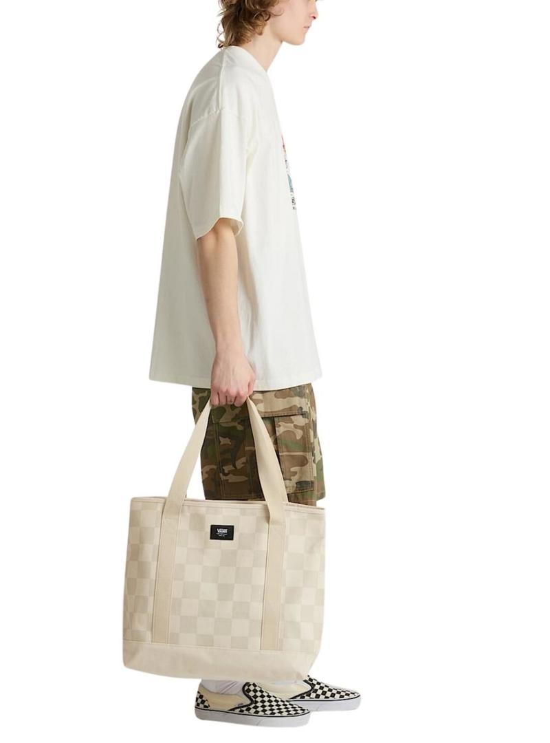 Bolsa Vans. Modelo Pergs. Cor bege. Estampa checkerboard. Capacidade de 26 litros. Estilo tote. Patch da marca em contraste. Dupla alça de sujeição. Bolso interior. Dimensões: 38,1 cm x 40,6 cm x 17,8 cm. Sem zíper.