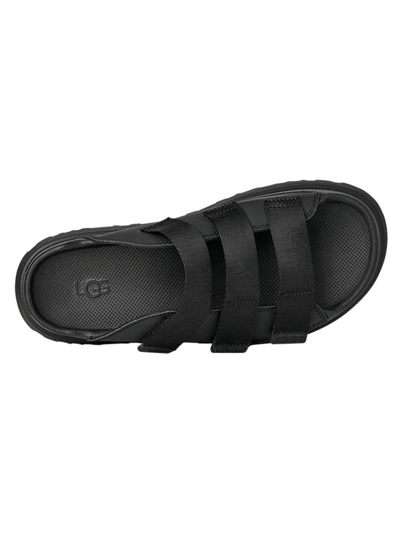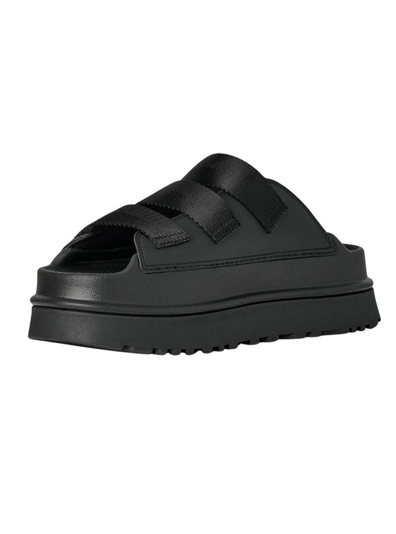 Sandálias UGG. Modelo Goldenglow slide. Cor preto. Parte superior com três tiras ajustáveis. Fechamento com velcro. Sola e entressola de EVA de cana-de-açúcar. Logo em relevo. Palmilha antiderrapante.