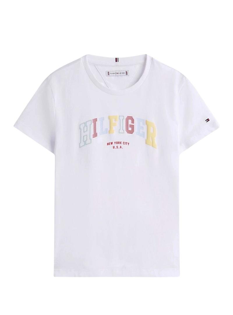 Camiseta Tommy Hilfiger. Modelo Varsity. Cor branca. Gola redonda. Manga curta. Logotipo bordado na manga. Marca estampada no peito multicolorido. Ajuste regular.
