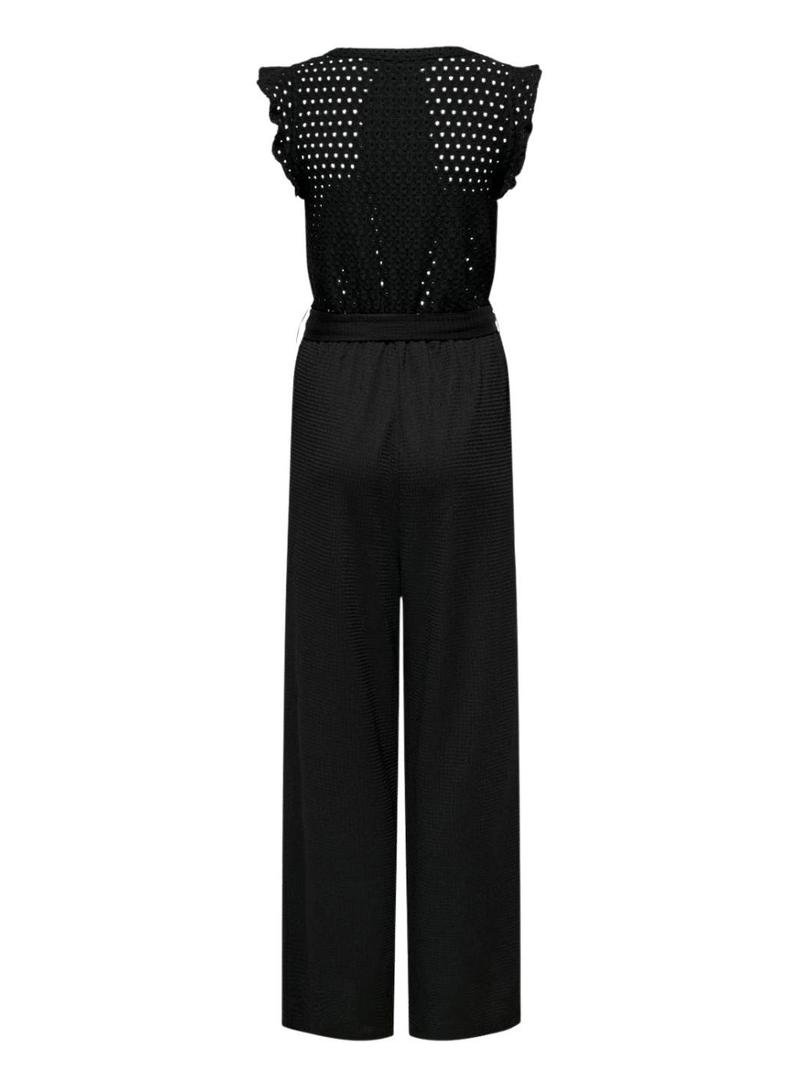 Macacão Only . Modelo Elisa. Cor preta. Fecho frontal com botões. Cinto na cintura que realça a silhueta. Detalhes de babados volumosos. Perna larga. Mangas com babados.