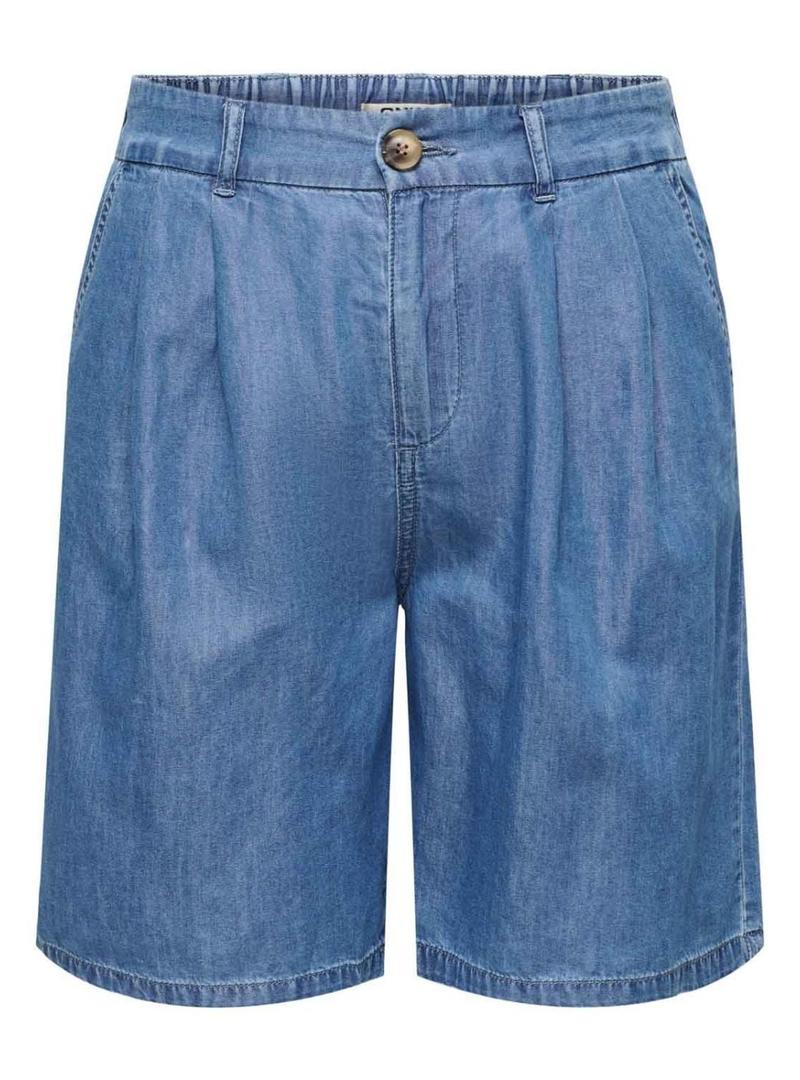 Apenas Bermuda. Modelo Bea. Tecido de denim azul. Fecho com botão e zíper. Cintura elástica atrás. Passadores para cinto. Comprimento acima do joelho. Bolsos laterais e traseiros.