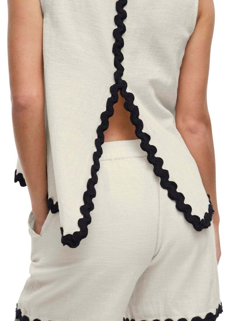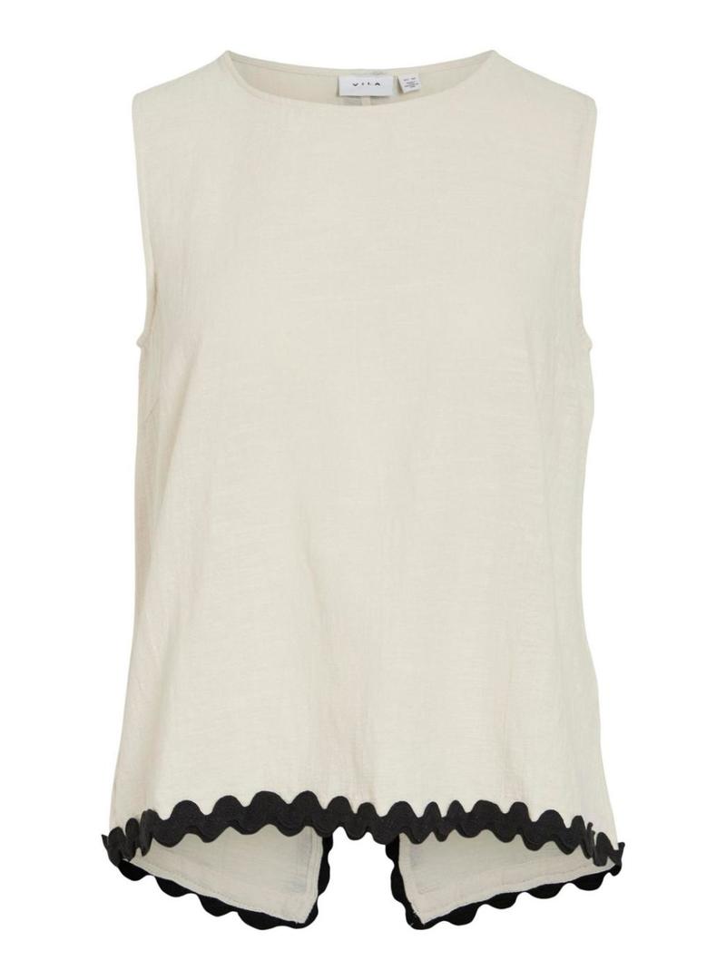 Top Vila. Modelo Manda. Cor bege. Sem mangas. Gola redonda. Abertura na parte de trás. Bordas festonadas. Corte folgado.