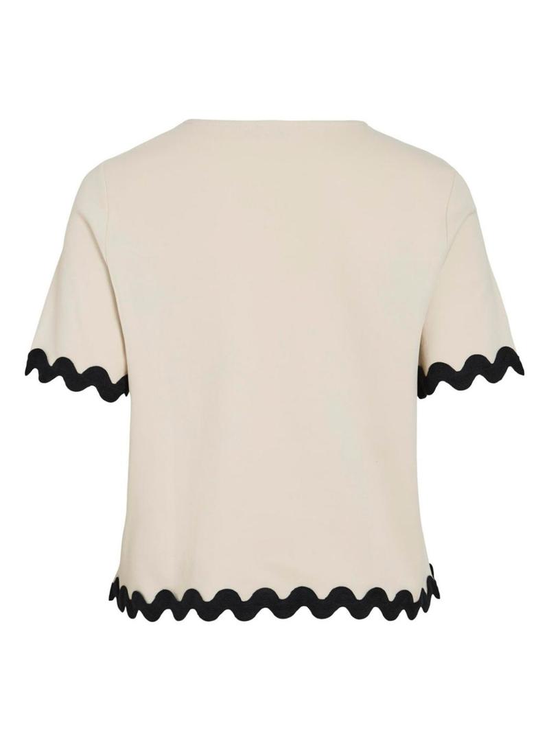 Top Vila. Modelo Calisa. Cor bege. Gola redonda. Manga curta. Acabamentos festonados. Corte regular.