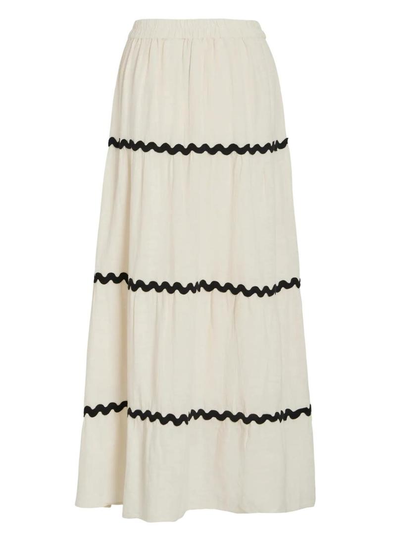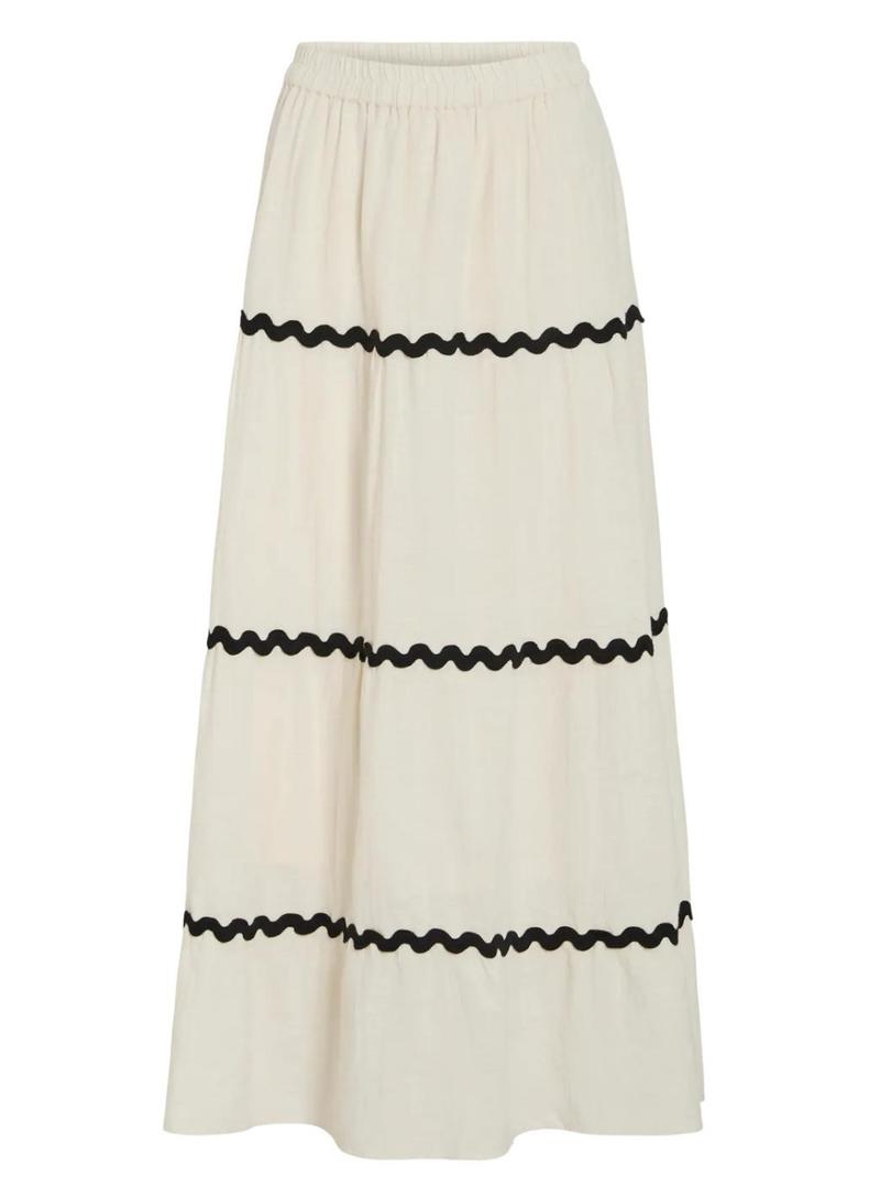 Saia Vila. Modelo Manda. Cor bege. Comprimento maxi. Cintura elástica. Detalhes festonados. Forro interno. Corte regular.