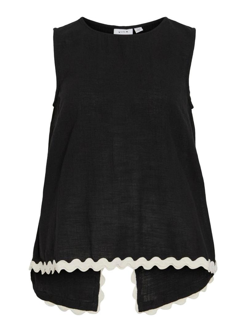 Top Vila. Modelo Manda. Cor preta. Sem mangas. Gola redonda. Abertura nas costas. Bordas festonadas. Corte folgado.