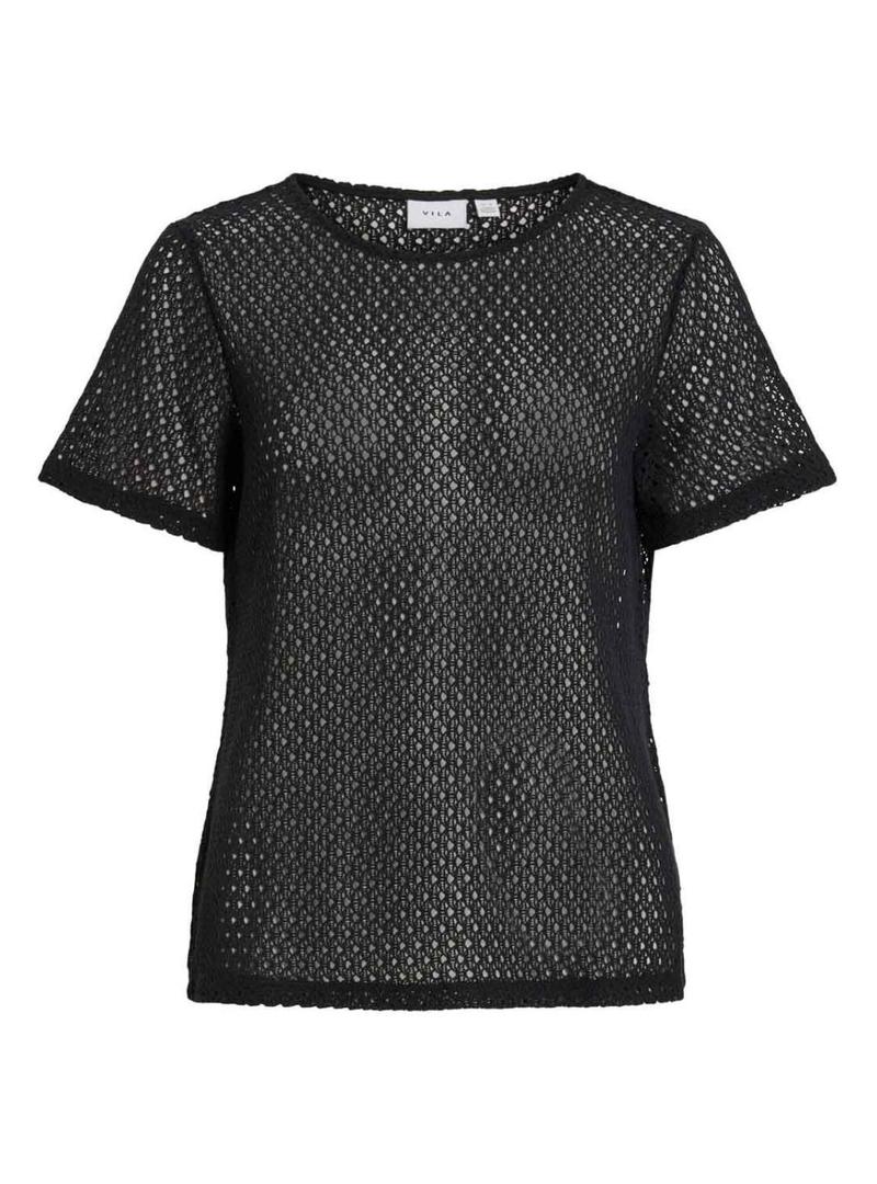 Camiseta Vila. Modelo Mine. Cor preta. Manga curta. Gola redonda. Tecido vazado. Corte regular.