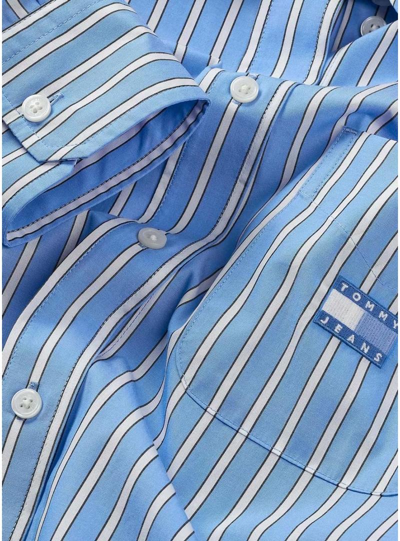 Vestido Tommy Jeans. Modelo Oversized. Cor azul. Ajuste folgado. Estilo camiseiro. Corte mini. Fechamento com botões. Estampado com listras verticais. Bolso de remendo no peito com logotipo.