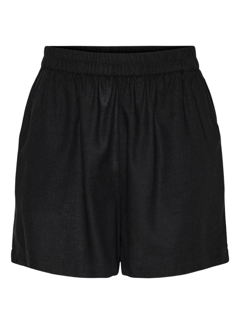 Peças curtas. Modelo Pia. Cor preta. Estilo jogger. Cintura elástica. Comprimento mini. Bolsos laterais. Tecido leve com linho.