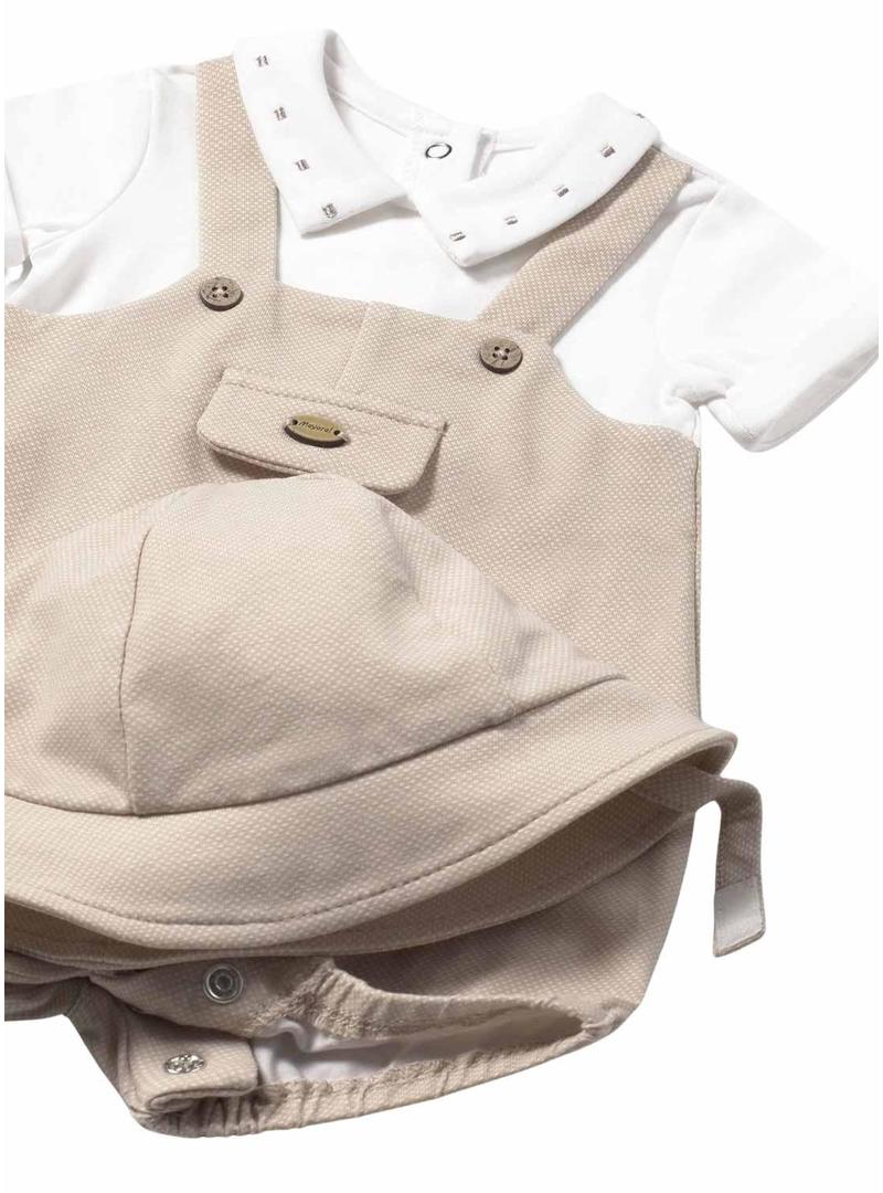 Macacão, colete e chapéu Mayoral bege para bebê.