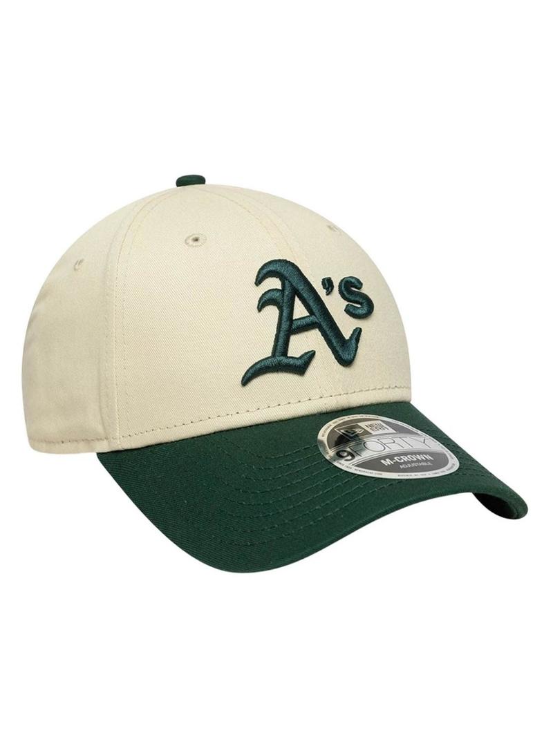 Boné New Era. Modelo 9FORTY dos Oakland Athletics. Cor bege e verde. Design de blocos de cores da MLB. Logotipo dos Oakland Athletics bordado na frente. Logotipo da MLB no arco traseiro. Bandeira da New Era bordada no lado esquerdo. Coroa moderna estruturada. Boné de beisebol ajustável. Aba curva de cor verde escuro com aba inferior também em verde escuro.
