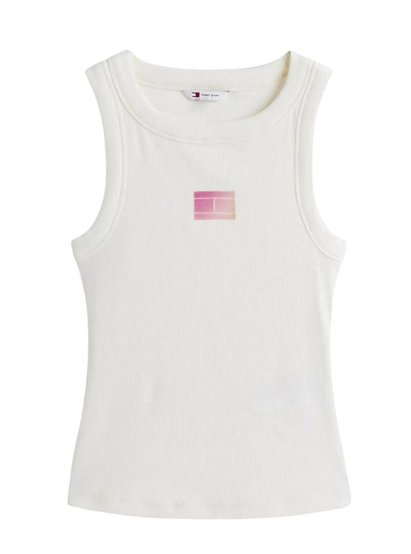 Camiseta Tommy Jeans. Modelo Gradiente. Cor branca. Gola redonda. Sem mangas. Alças largas. Tecido canelado. Corte ajustado. Estilo regata. Logo estampado com degradê rosa no peito.