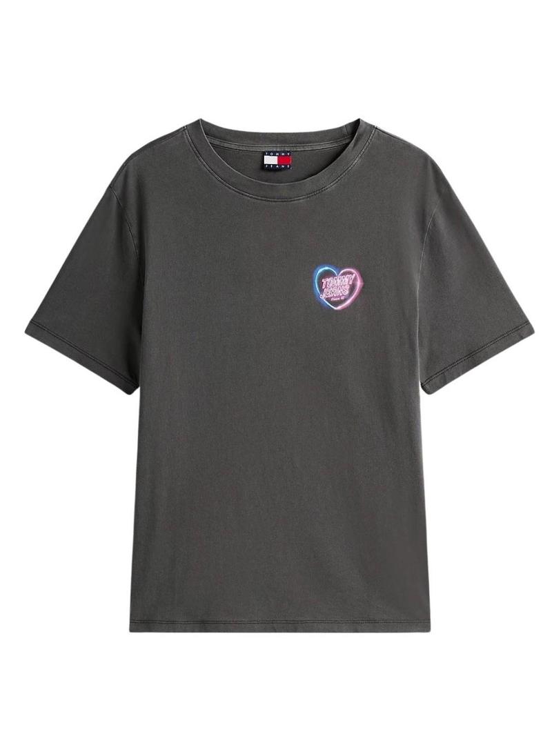 Camiseta Tommy Jeans. Modelo Neon. Cor cinza. Efeito lavado. Gola redonda. Manga curta. Ajuste folgado. Logo estampado no peito e nas costas com estilo neon. Detalhes em rosa e azul.