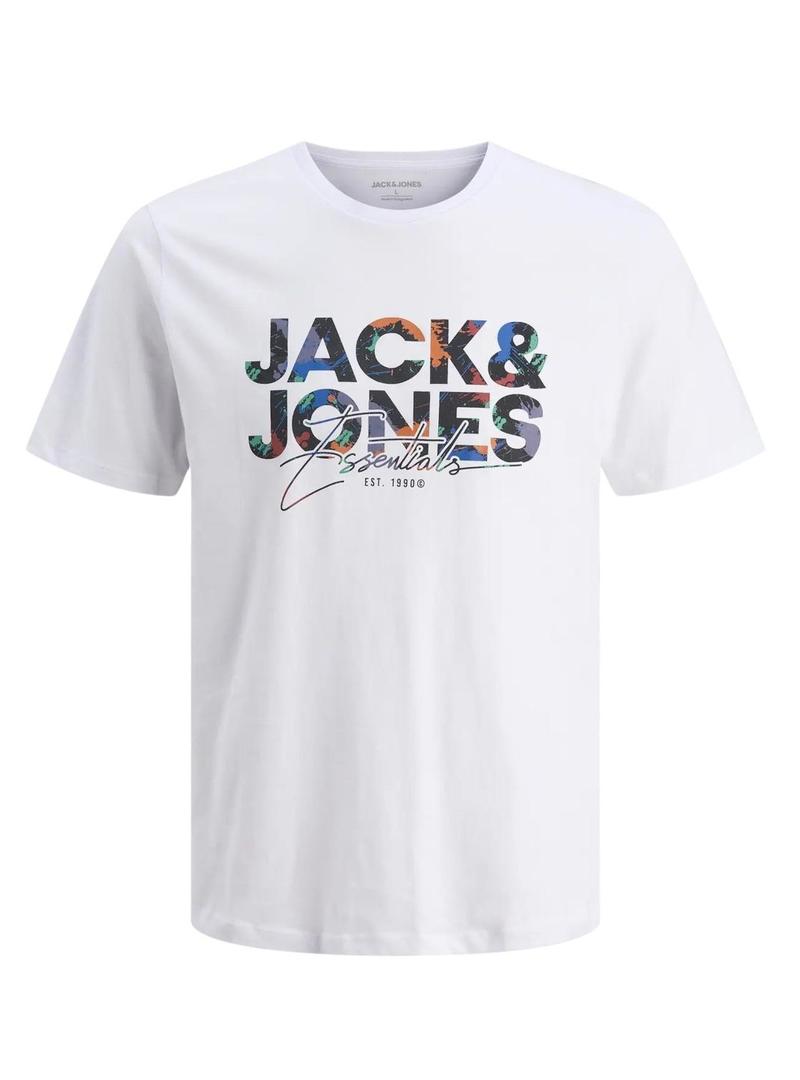 Camiseta Jack and Jones. Modelo Geplas. Cor branca. Gola redonda. Manga curta. Gráfico estampado no peito. Corte regular. Lavar do avesso.