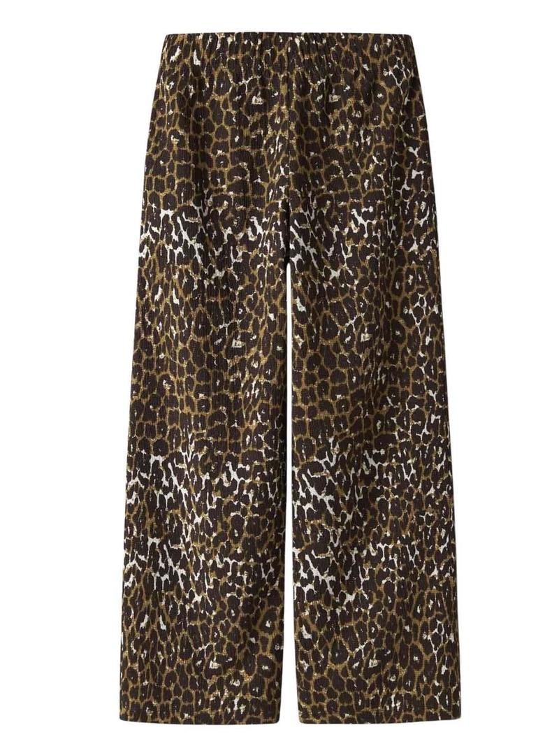 Calça Name It. Modelo Lotta. Estampa de leopardo. Cintura elástica. Tecido fluído. Bolsos laterais. Perna larga.