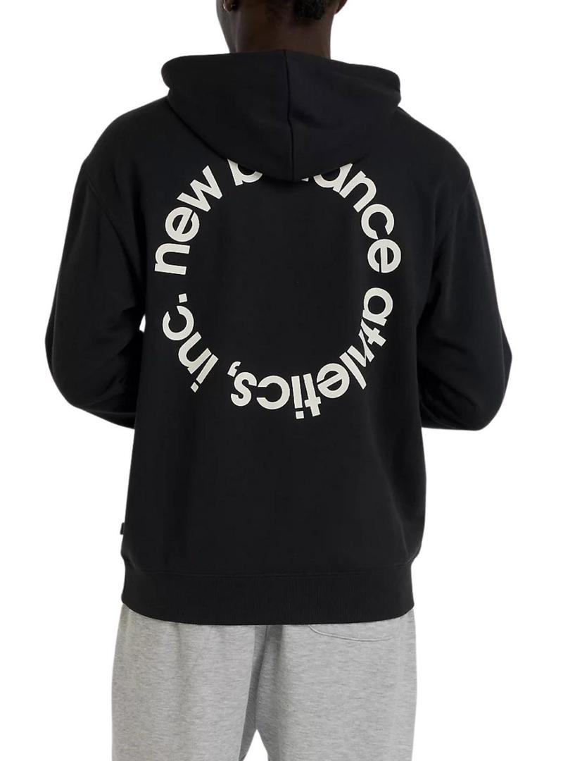 Moletom New Balance. Modelo Circular Logo. Cor preta. Com capuz. Bolso canguru. Manga comprida. Extremidades caneladas. Logo circular estampado no peito e nas costas em contraste.