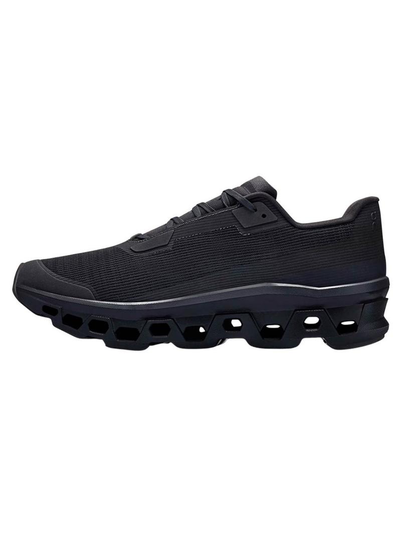 Tênis On Running. Modelo Cloudmonster Void. Cor preta. Novo tecido superior em malha técnica. Logotipo minimalista. Speedboard que proporciona maior estabilidade. Almofadas de borracha que garantem aderência e tração. Com superespuma Helion. Detalhes em camurça sintética.