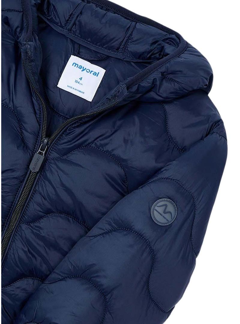 Casaco acolchoado Mayoral. Cor azul marinho. Manga comprida. Com capuz. Fecho com zíper. Exterior com painéis acolchoados. Bolsos na parte da frente. Remendo da marca em uma manga.