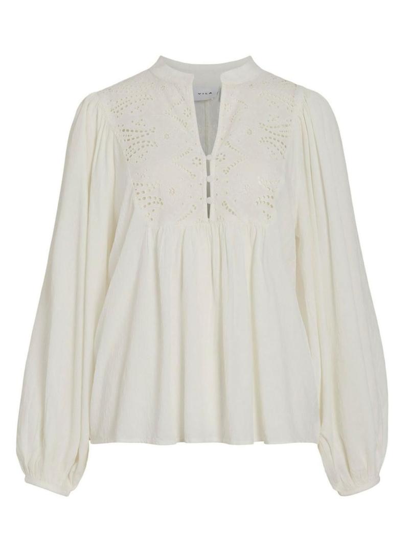 Blusa Vila. Gola em V. Mangas compridas volumosas. Gola com botões. Detalhes de renda no peito e nas costas. Cor bege. Corte regular. O modelo veste o tamanho 36.