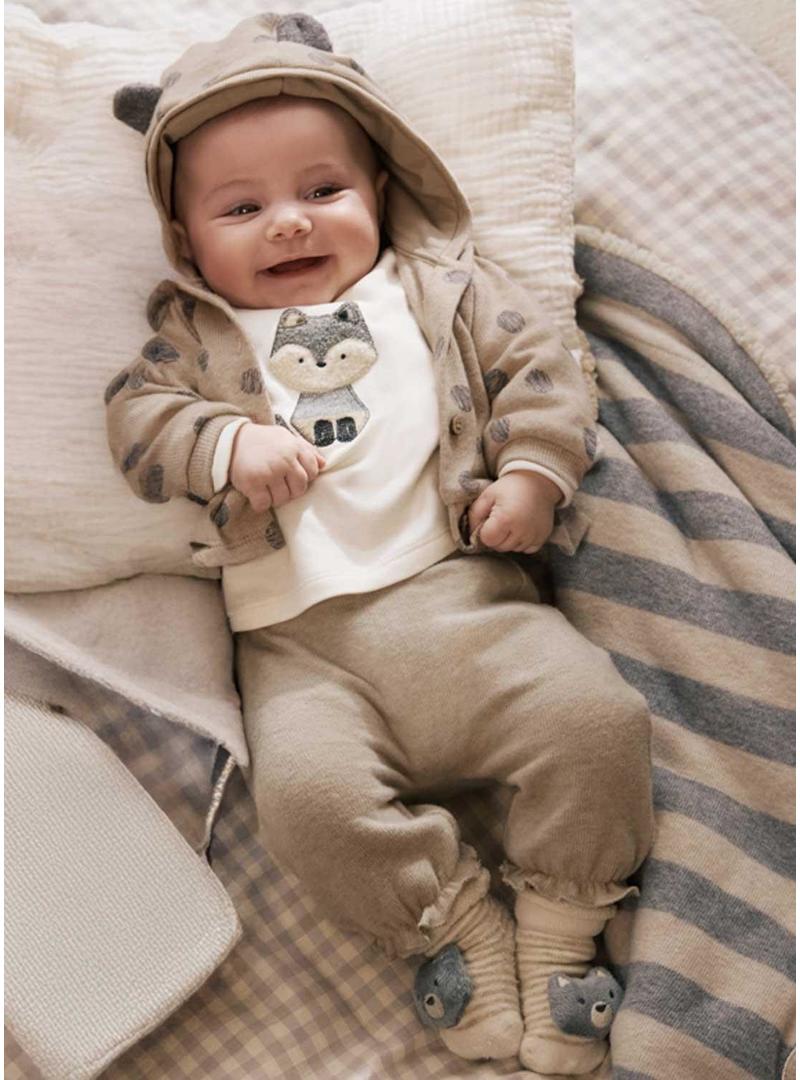 Conjunto de três peças da marca Mayoral em ponto tostado para bebê.