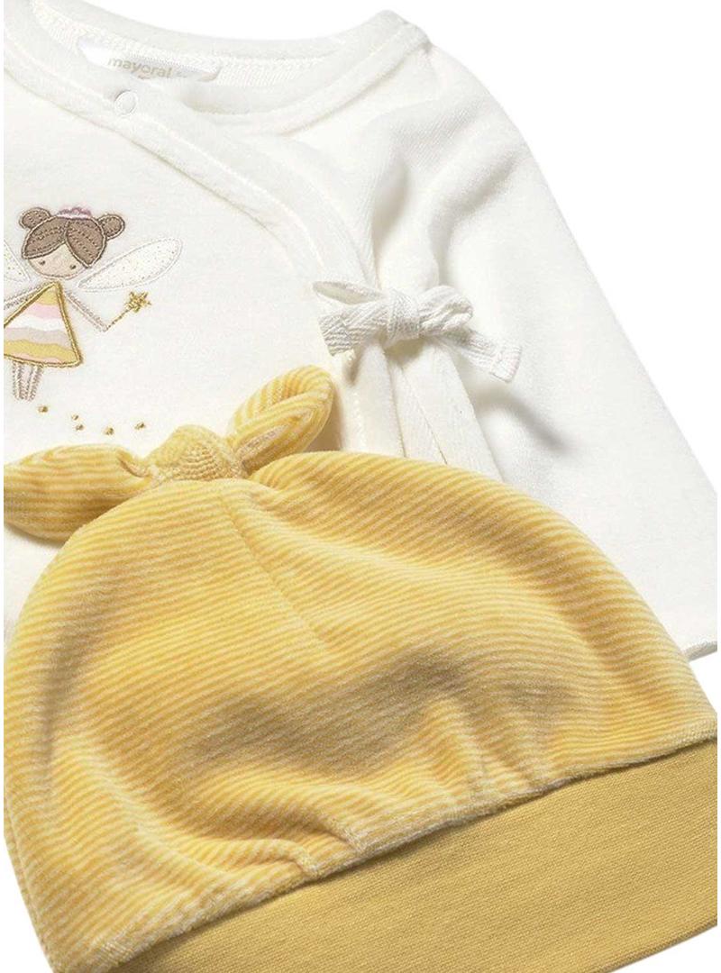 Conjunto Mayoral 3 peças. Camiseta de manga comprida para recém-nascido. Fecho frontal cruzado. Gola em V. Desenho na parte da frente. Calça com pés tipo polaina. Cintura elástica. Cor amarela. Gorro amarelo com laço.