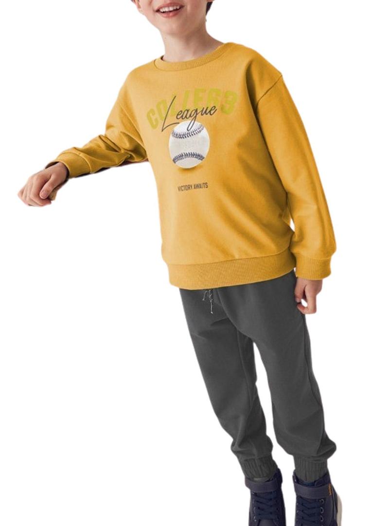 Fato de treino Mayoral. Duas peças. Suéter com gola redonda. Cor de mostarda. Manga comprida. Estampa de beisebol na parte da frente. Calças compridas. Cor cinza. Cintura de elástico ajustável com cordões. Joelheiras reforçadas no interior.