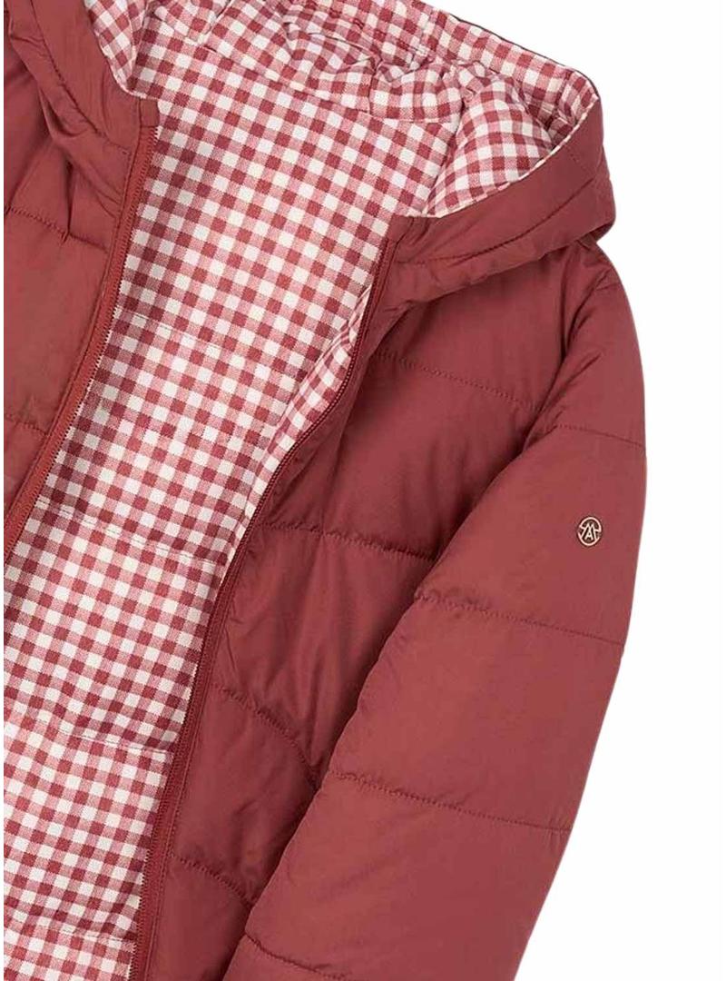 Casaco Mayoral. Cor granada. Manga comprida. Gola alta. Com capuz. Fecho frontal com zíper. Exterior têxtil acolchoado. Modelo reversível. Interior com estampa de xadrez. Parte traseira ligeiramente mais comprida. Bolsos frontais.