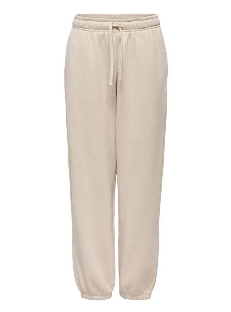 Calças Only. Modelo Best. Cor bege. Tecido mesclado. Estilo jogger. Cintura elástica. Bolsos laterais. Corte largo. Punhos elásticos na bainha.