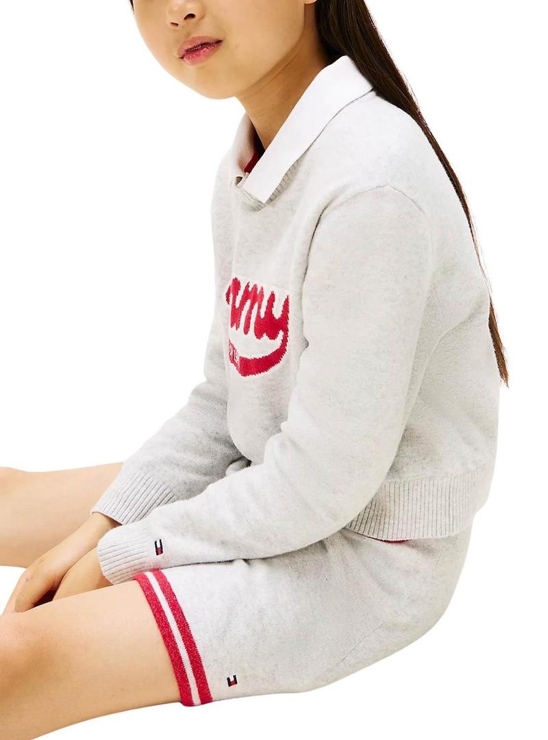 Saia Tommy Hilfiger. Cor cinza. Mini formato. Tecido de malha. Listras contrastantes na bainha. Cintura elástica. Logo da Tommy Hilfiger bordado na bainha. Corte regular.