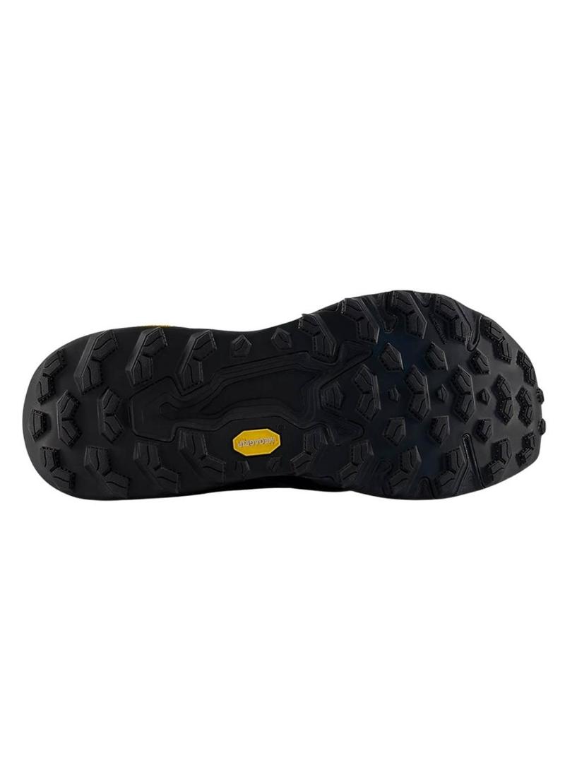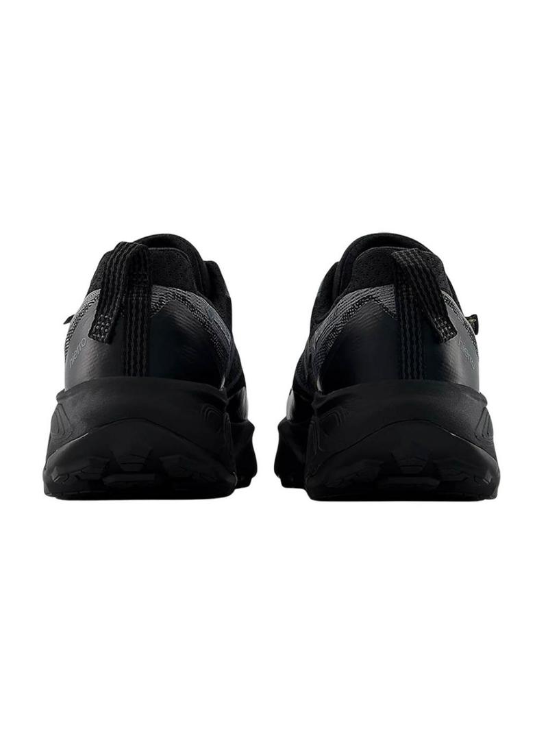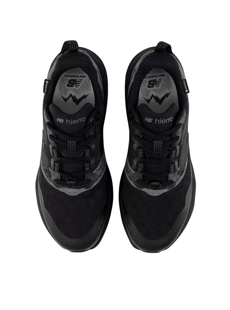 Tênis New Balance. Modelo Fresh Foam X Hierro v9. Cor preta. Logotipo lateral. Projetado para trekking. A espuma da entressola Fresh Foam X de dupla densidade que favorece a amortecimento. A sola Vibram Megagrip com a tecnologia Traction Lug oferece uma aderência superior tanto em terrenos úmidos como secos. A tecnologia Toe Protect ajuda a proteger os pés de pedras, raízes e resíduos. Sua língua reforçada oferece um ajuste seguro e impede que pedras entrem. Muito leve 314 gramas.