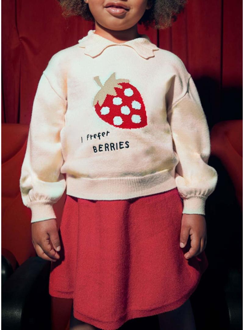 Camisola Mayoral. Gola de bebê. Banda elástica na barra. Morango com estampa intarsia. Detalhes bordados. Manga comprida. Saia de malha. Cor vermelha. Cintura elástica. Comprimento curto.