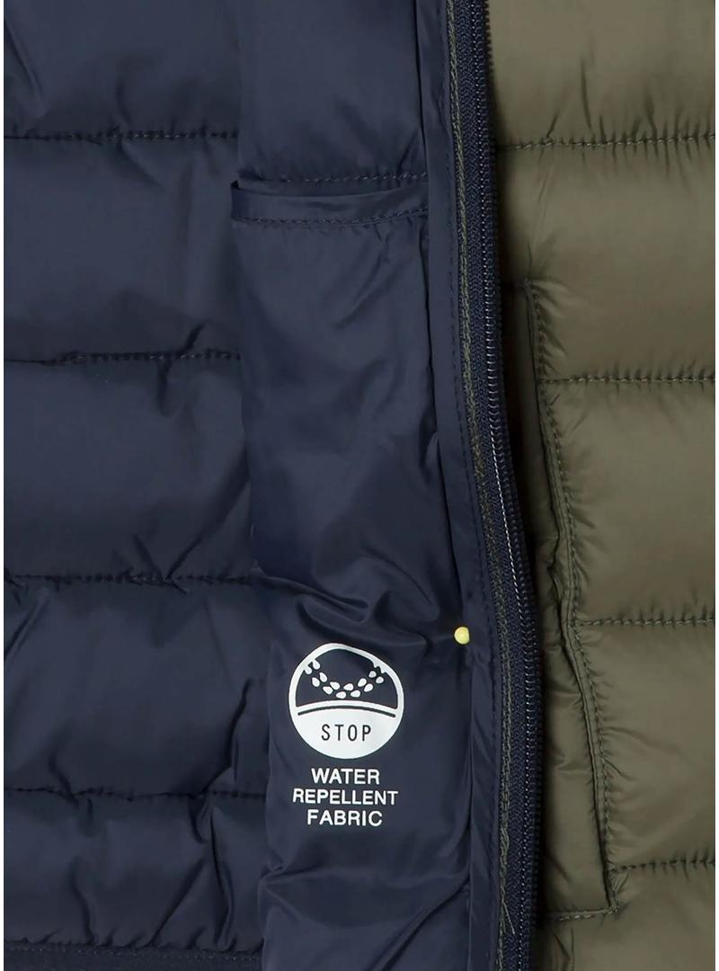 Colete Pepe Jeans. Painéis horizontais acolchoados. Cor verde. Tecido impermeável. Gola alta. Fecho com zíper. Bolsos laterais. Logotipo no peito. Barra elástica. Confeccionado em nylon.