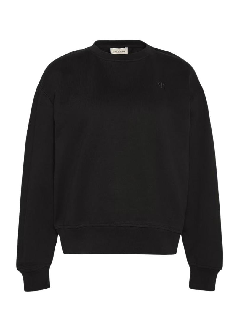 Moletom Calvin Klein Jeans, Cor preta. Tecido de pelúcia. Gola redonda. Bordado da Calvin Klein no tom. Acabamentos canelados. Corte folgado. Manga comprida. Ombros caídos. O modelo veste tamanho S.