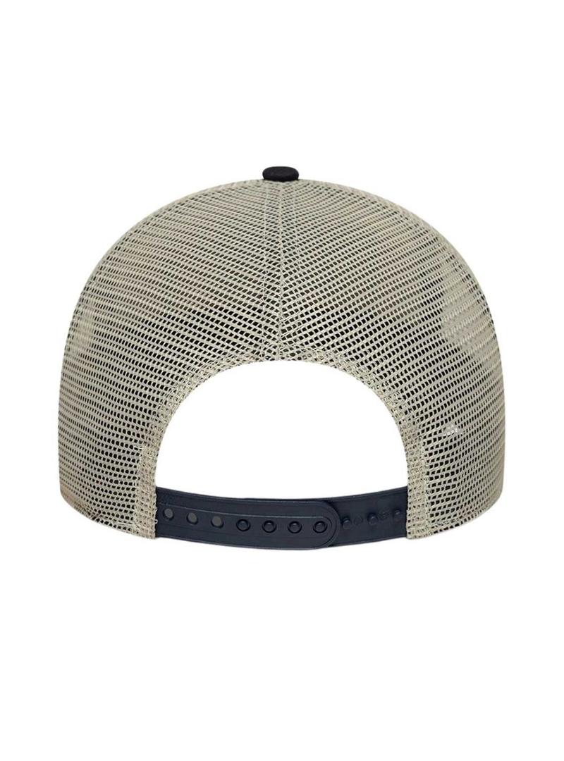 Boné New Era. Modelo Animal Patch. Estilo Trucker. Cor bege. Viseira curvada em preto com costuras em contraste. Logotipo bordado na parte da frente com ilustração animal. Parte traseira em tela. Fecho ajustável na parte de trás.
