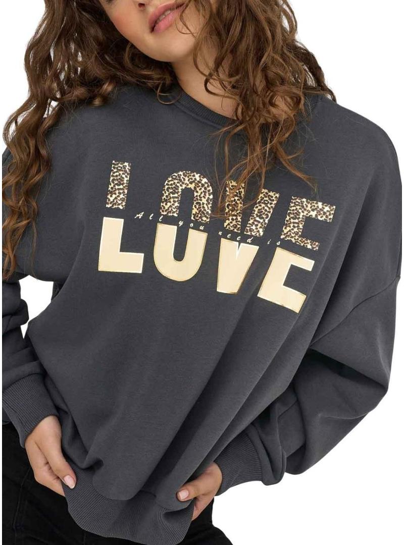 Moletom Only. Modelo Tammie. Cor cinza. Mensagem Love estampada no peito com detalhes em animal print. Gola redonda. Extremidades caneladas. Ajuste folgado. Ombro caído.