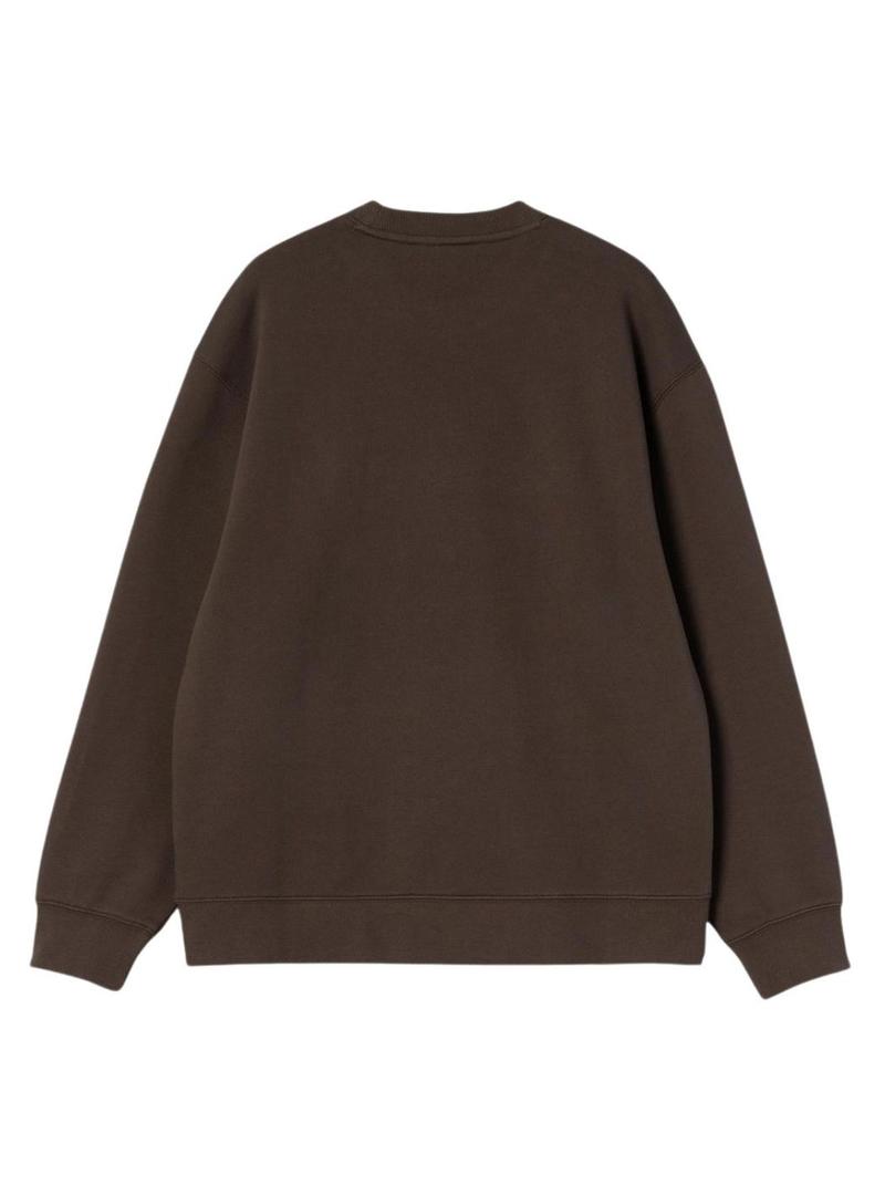 Moletom Carhartt. Modelo Script. Cor marrom. Gola redonda. Manga comprida. Extremidades caneladas. Ajuste levemente folgado. Ombros caídos. Marca bordada no peito com linha rosa.