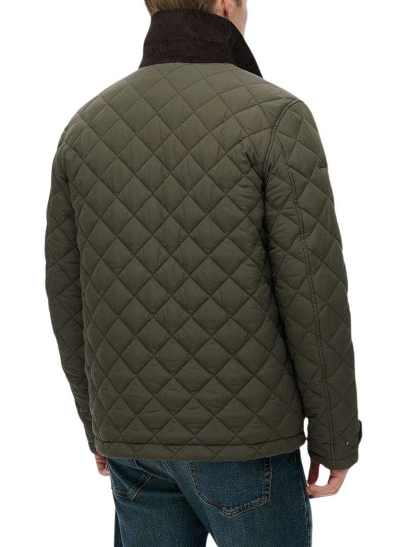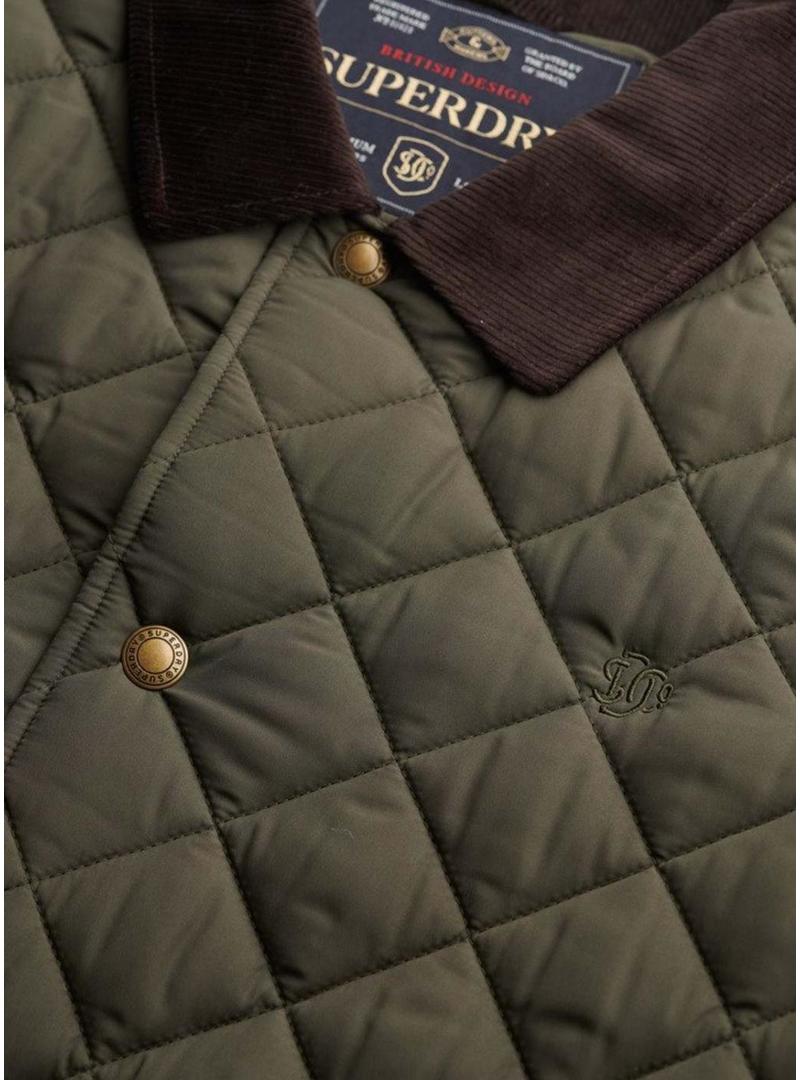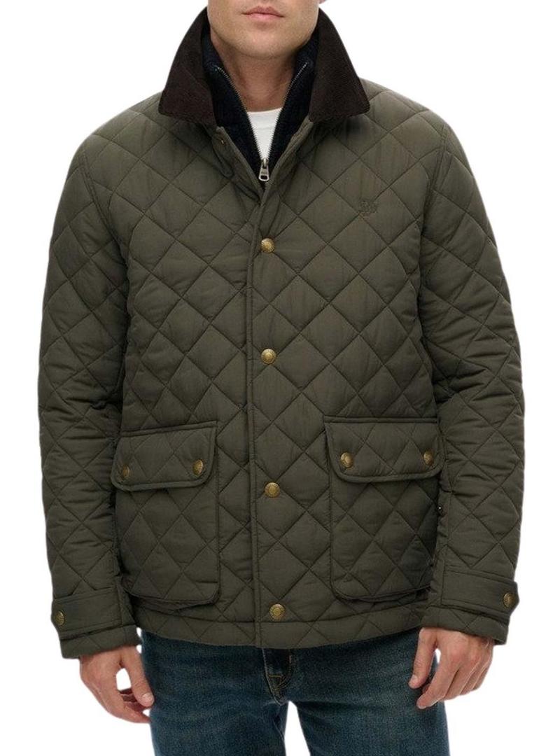 Jaqueta Superdry. Modelo acolchoado. Cor verde. Corte clássico. Fechamento com botões de pressão. Gola de veludo marrom. Bolsos com lapela laterais. Detalhes em dourado. Tecido principal com acolchoado geométrico.