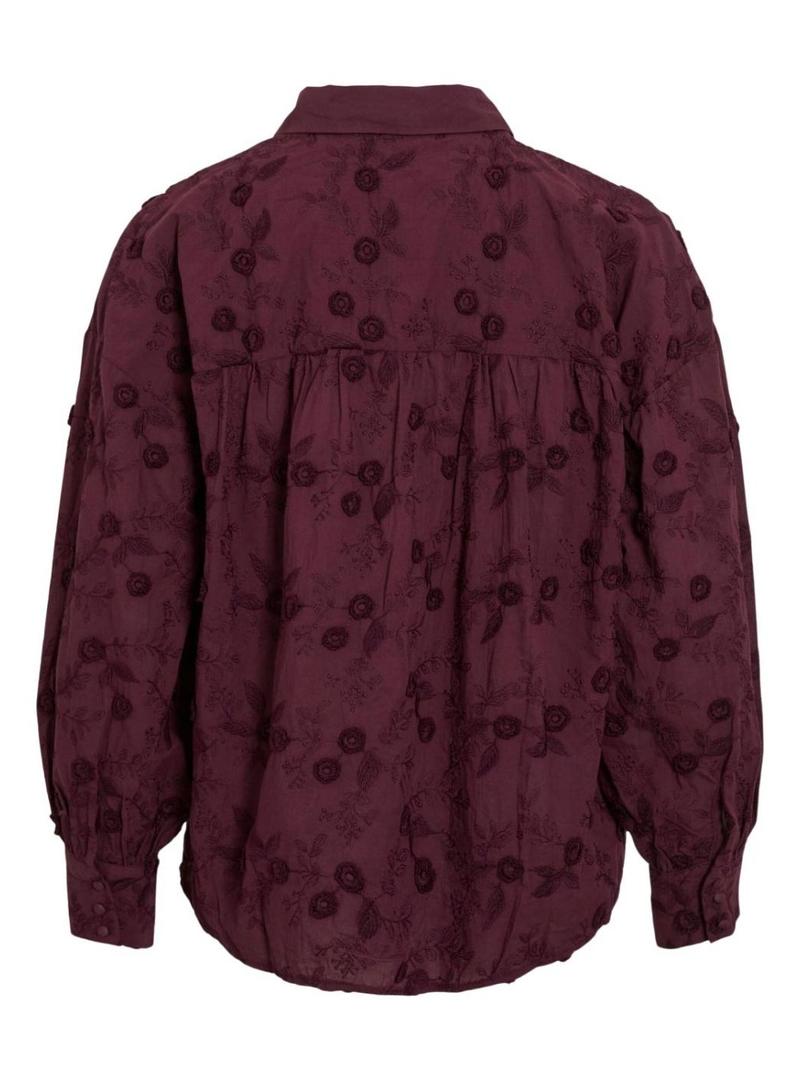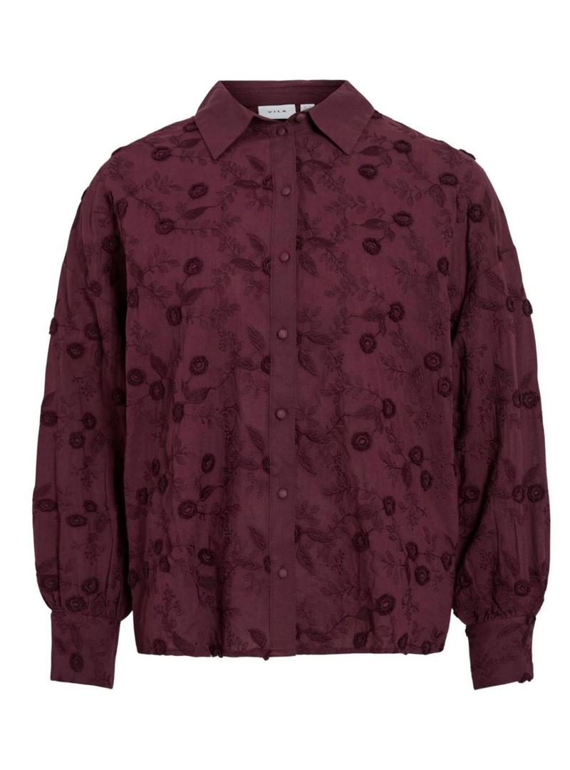 Camisa Vila. Modelo Visimone. Cor granada. Tecido com flores bordadas. Ajuste regular. Mangas com leve volume. Botões do mesmo tom.