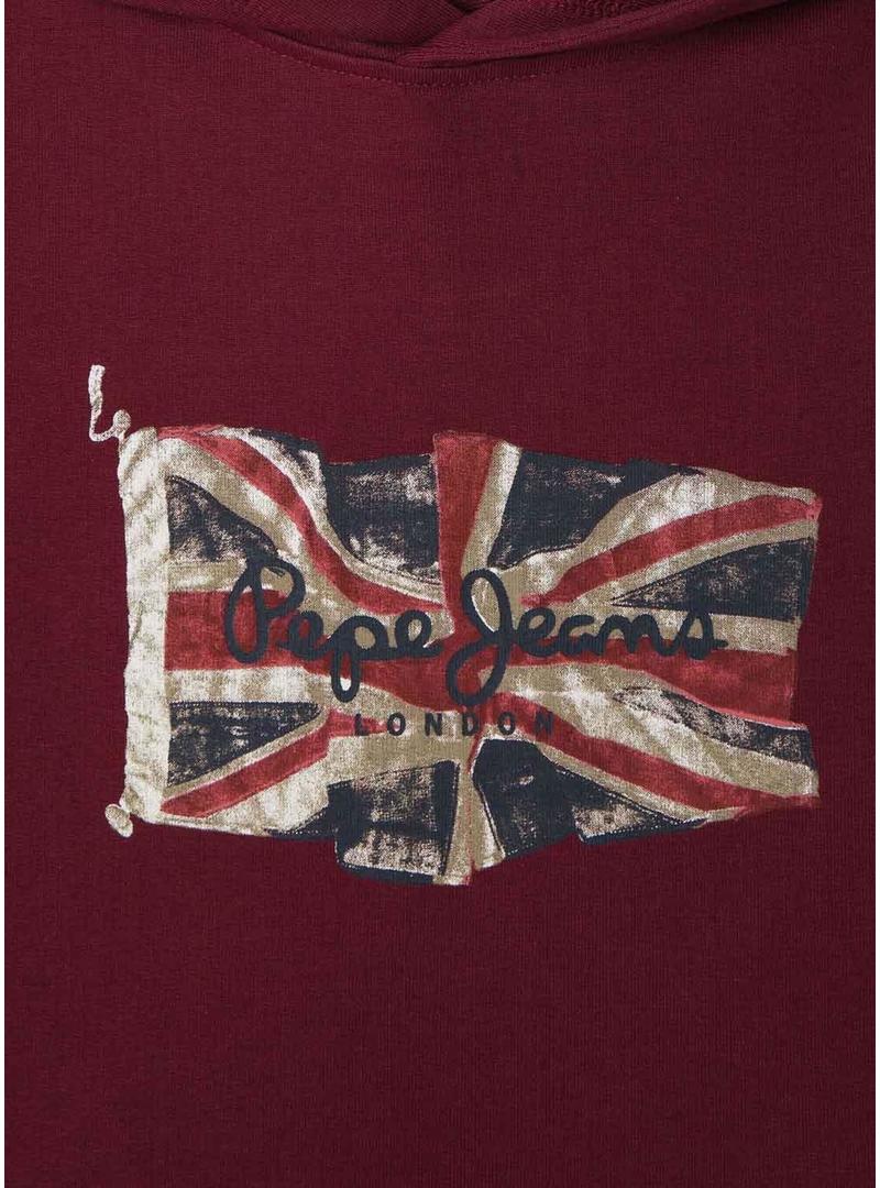 Moletom Pepe Jeans. Cor granate. Com capuz. Corte regular. Bolso canguru. Bandeira da União Jack estampada no peito. Manga comprida. Acabamentos canelados.