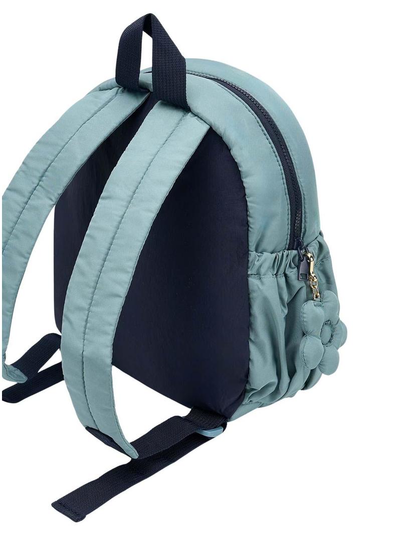 Mochila Mayoral. Cor verde. Fecho superior com zíper. Parte da frente acolchoada. Bolso frontal com estampa de xadrez. Bolsos laterais. Alça superior em contraste. Duas alças ajustáveis. Flor decorativa removível.