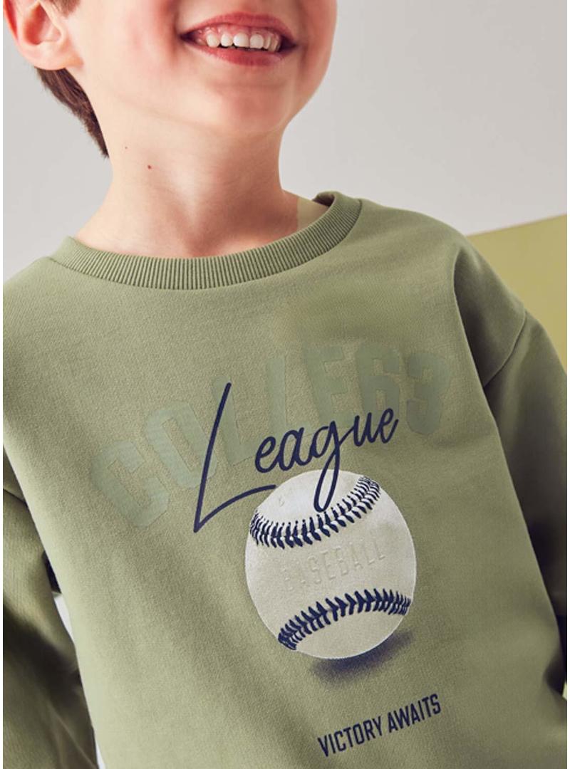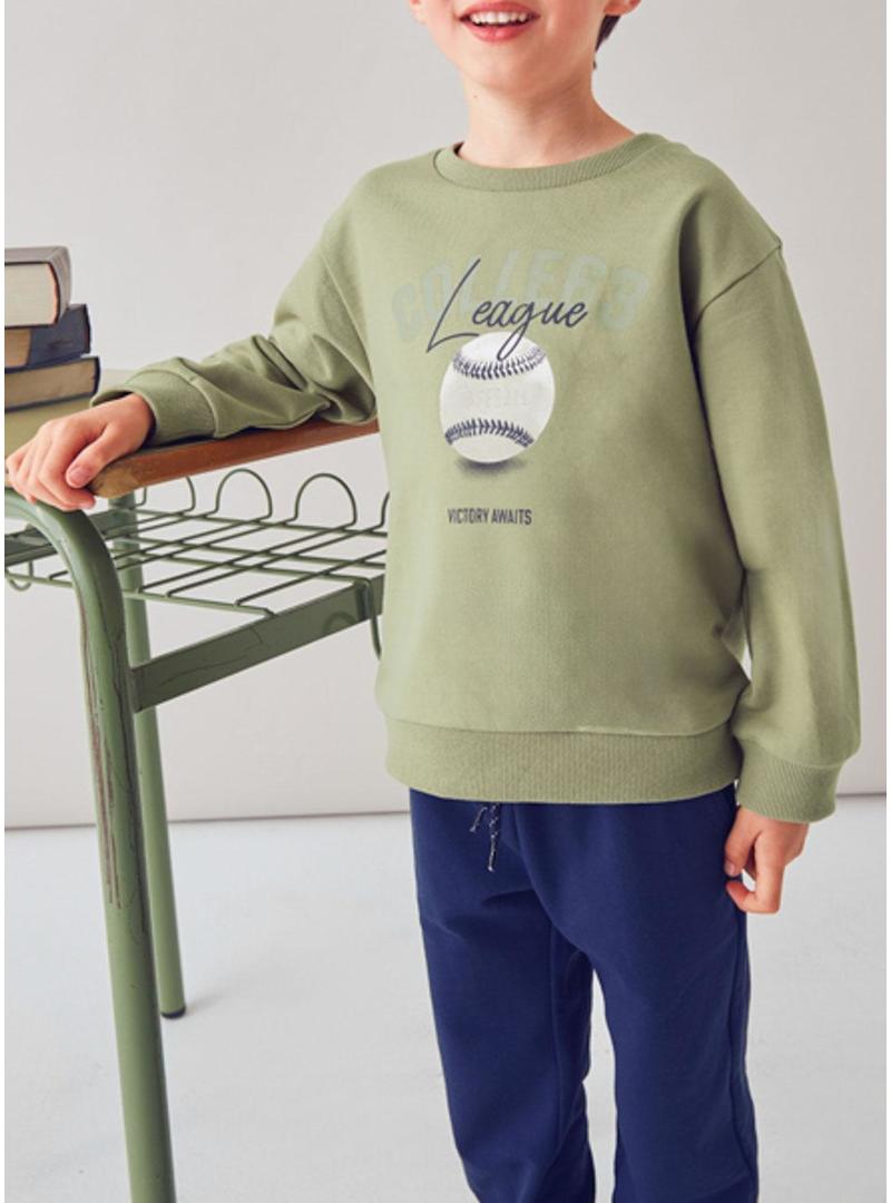 Conjunto Mayoral. Moletom verde. Estampa universitária no peito. Mangas compridas. Ombros caídos. Acabamentos canelados. Calça esportiva azul-marinho. Cintura de elástico com cordão. Bolsos laterais. Barra elástica.
