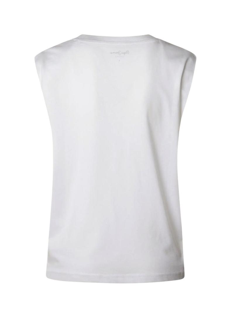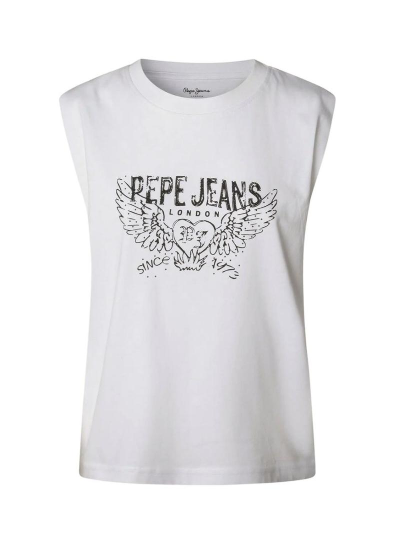 Camiseta Pepe Jeans. Tecido leve. Cor branca. Gola redonda canelada. Sem mangas. Logotipo com efeito desgastado estampado no peito. Tachinhas decorativas no estampado. A modelo veste o tamanho S.