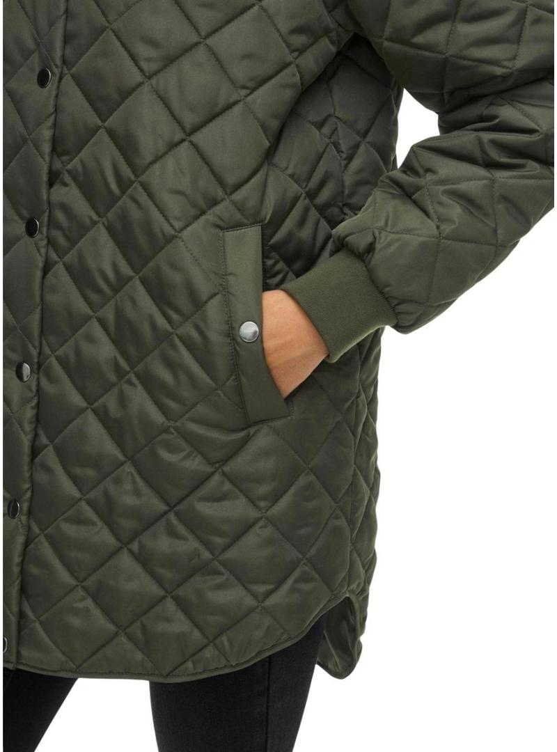 Casaco acolchoado da Vila. Modelo Vitate. Cor verde. Com capuz. Fechamento com botões de pressão. Corte regular. Bolsos frontais com botão. Desenho de losangos. Ligeiramente mais comprido na parte de trás.