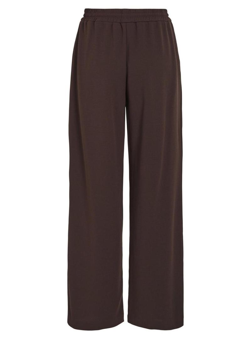 Calça Vila. Modelo Viclua. Cor marrom. Cintura alta elástica e ajustável com cordão. Bolsos laterais. Perna larga. Costuras centrais decorativas. Tecido elástico.
