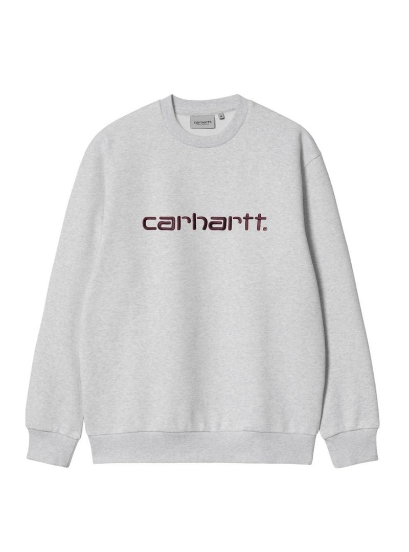 Moletom Carhartt. Modelo básico com marca no peito. Gola redonda. Cor cinza mesclado. Logotipo bordado em cor granada. Extremidades caneladas. Ajuste regular.