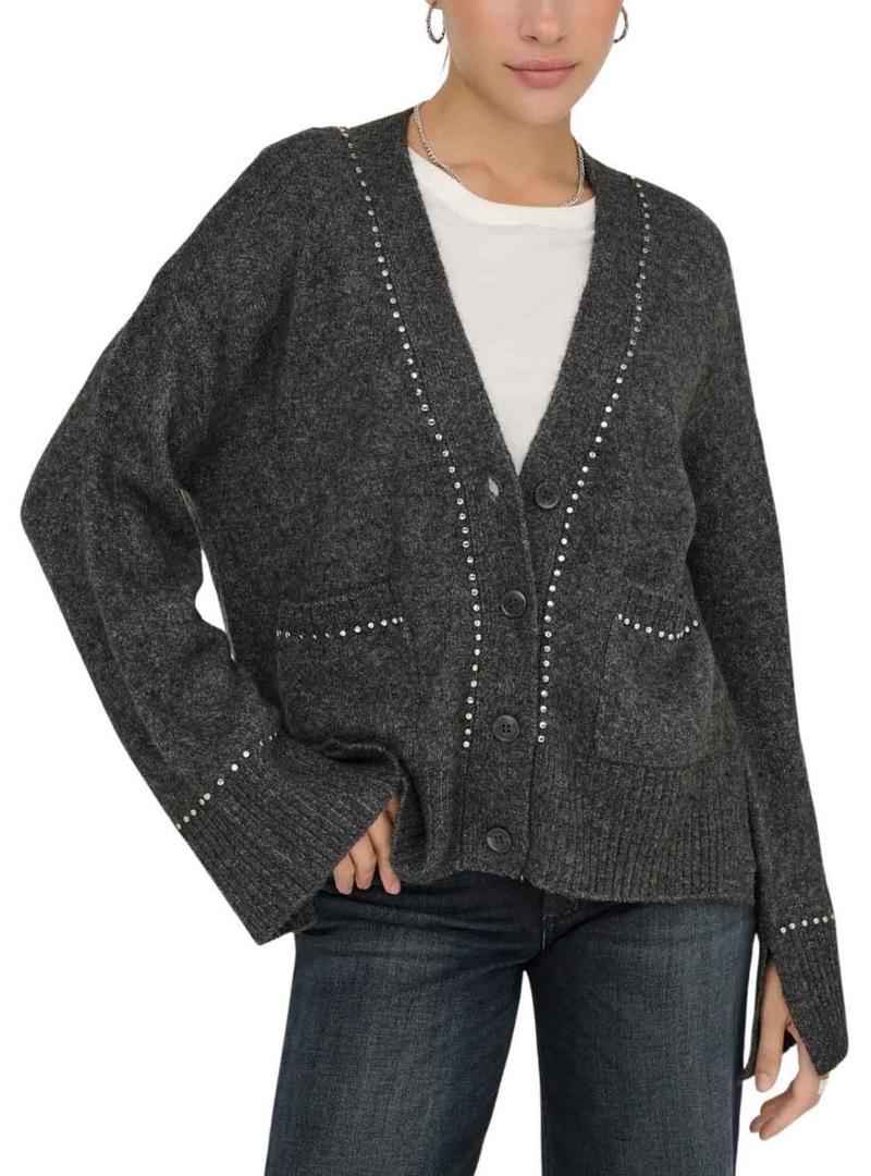 Jaqueta Only. Modelo Elsie. Cor cinza. Decote em V. Fecho com botões. Ajuste folgado. Extremidades caneladas. Bolsos laterais de patch. Detalhes com tachas.