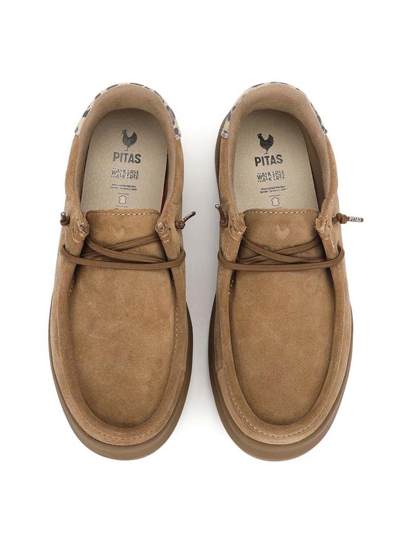 Sapatos Walkin Pitas para mulher. Modelo Lyon. Cor camelo. Corte em Nobuck hidrofugado repelente à água com cordões elásticos. Forro têxtil que proporciona conforto. Palmilha de EVA com palmilha de couro. Sola TRACK de EVA ultraleve com borracha antiderrapante, que oferece excelente aderência e isolamento para dias chuvosos e úmidos. Detalhe animal print no calcanhar.